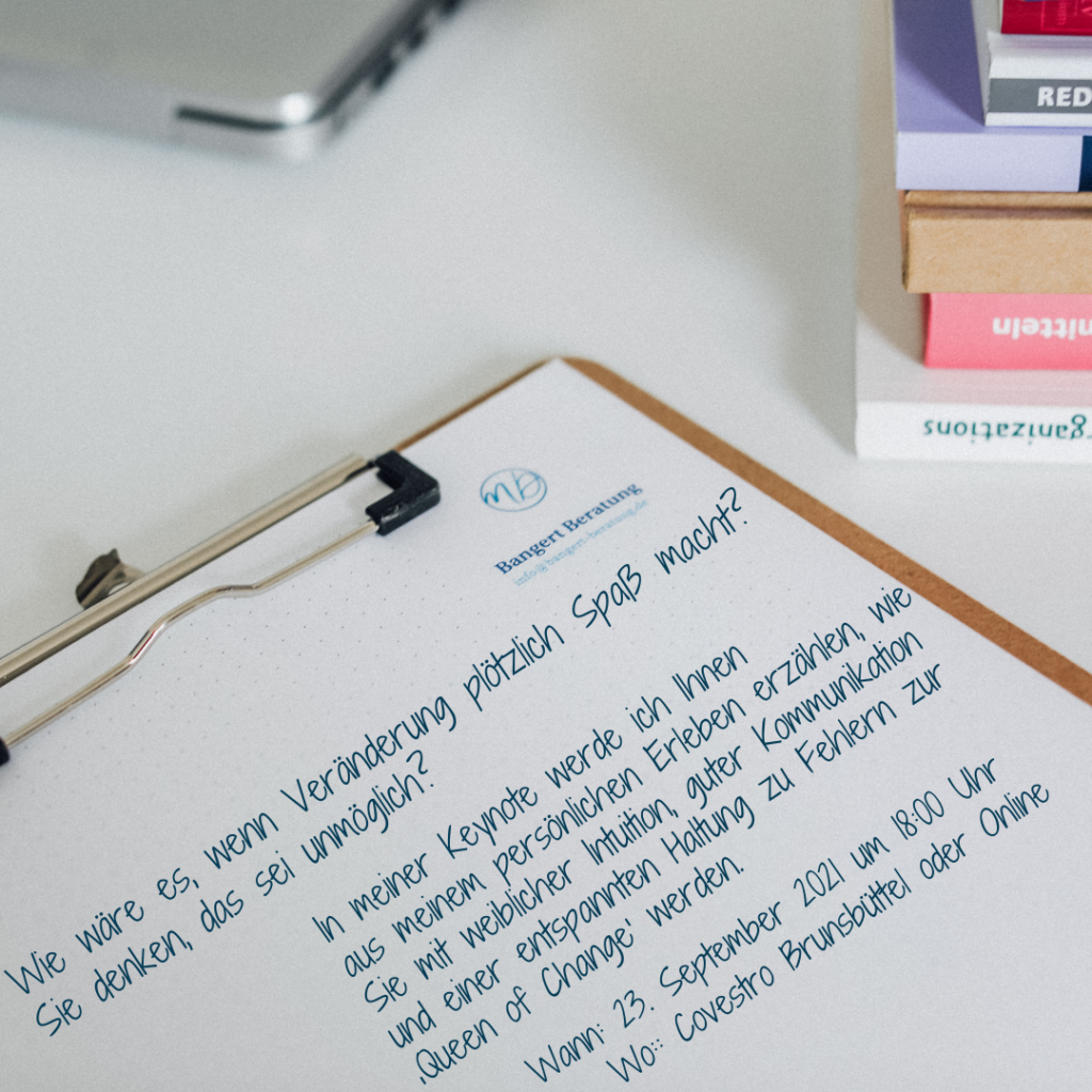 Mein Name ist Melanie Bangert, ich liebe und lebe Veränderungen. In meiner Keynote werde ich Dir aus meinem persönlichen Erleben erzählen, wie Du mit weiblicher Intuition, guter Kommunikation und einer entspannten Haltung zu Fehlern zur ‚Queen of Change‘ wirst.